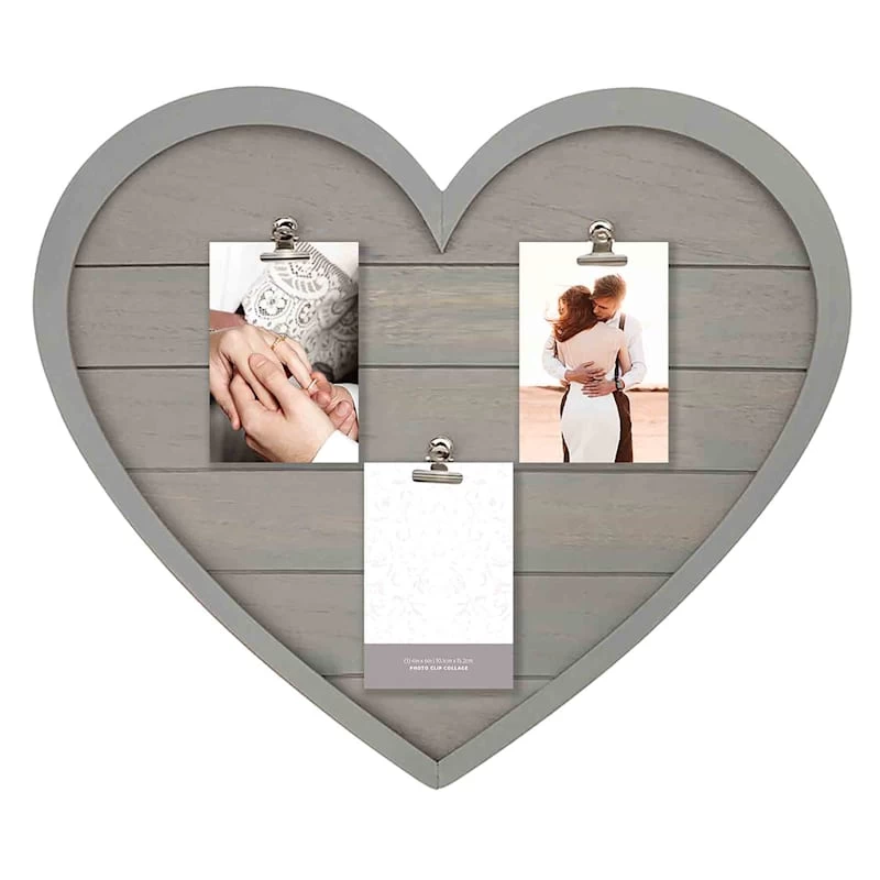 3-Opening Gray Plank Heart Shaped Photo Clip Collage Frame
