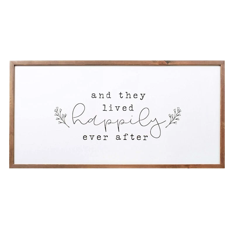 Modern farmhouse meets At Home prices in Honeybloom, our exclusive new brand that celebrates life lived together. This “and they lived happily ever after” 16×32 in. wall sign is an easy way to add a pop of charm to any room during the holidays. Bring new life to your rooms with this interesting framed wall art. Featuring a natural, brown and white coloration, this plaque will bring years of enjoyment and will add to your charming farmhouse setting.