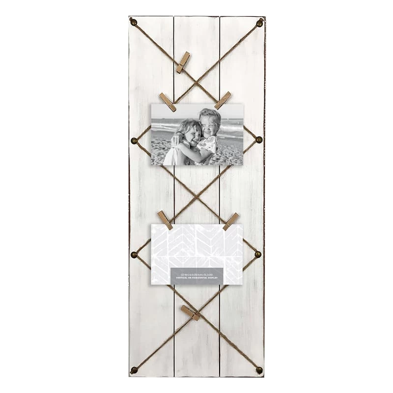 Whitewashed Plank String Collage With Clothespin Photo Clips, 10×25
